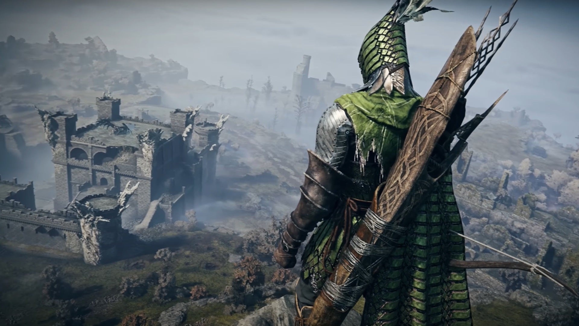Ironeye runs along the walls of the castle, the bow is ready, in Elden Ring: Nightreign.