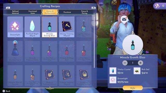 Additionally, you can operate the Potion of Miracle Growth. It is made of 10 Rich Earth, 500 Dream Light and 10 Vitalis Crystals. This Miracle Growth Elixir powers your water can, instantly increasing the yield of your field when watered.